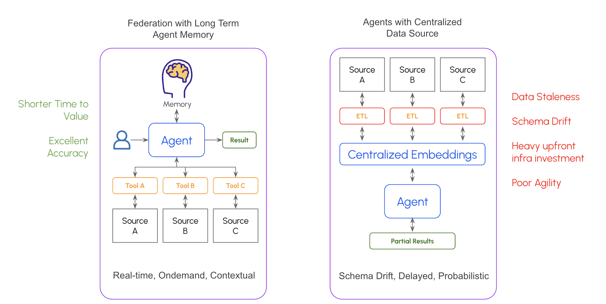 > Critical clarification: A Snowflake warehouse with an MCP server is federation. You’re querying data where it lives. The warehouse serves its purpose, and AI agents access it directly without needing a vector layer on top. Federation isn’t anti-warehouse, it’s anti-duplication.**What makes this viable now:**