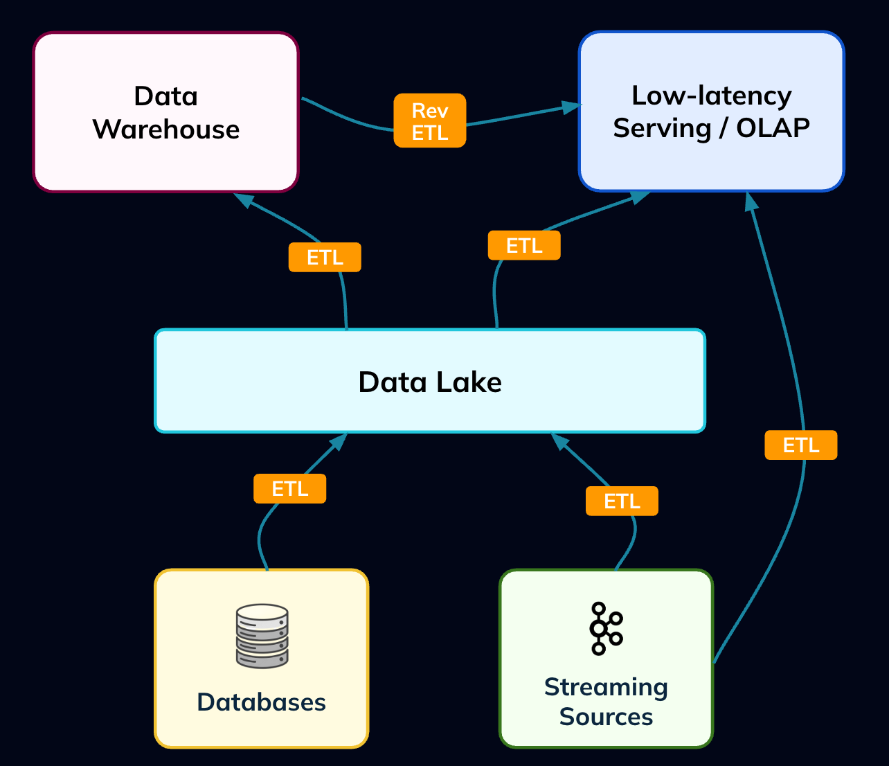 About a decade or so ago, a new set of use cases began to emerge in analytics -**Serving**. Unlike traditional analytics, which primarily focused on historical insights,**serving aimed to put analytics directly into the hands of users and applications**. This included powering end-user dashboards that update instantly, enabling personalized experiences, and providing live metrics for operational decision-making. The rise of serving workloads gave birth to OLAP and, in particular,**real-time analytics databases** such as Apache Pinot, ClickHouse, and others, which were purpose-built to handle the**high concurrency and extremely low-latency queries** these use cases demanded. While many of these systems ingested data in real time, they also often relied on ETL, either directly from sources or through reverse ETL from data warehouses, running in parallel with existing pipelines and further compounding the operational challenges associated with ETL.