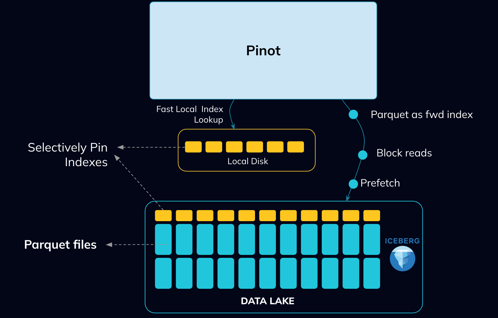 After making indexes work with the Parquet format, the next step was to make them optimally usable with cloud-native querying. To achieve this, we built the capability to**pin indexes locally**. This gives us the**flexibility to choose which indexes should be read directly from cloud storage and which should be read locally** for faster access, depending on the performance needs of different query patterns. Indexes are typically a small fraction of the data, so pinning them locally is an inexpensive tradeoff. These pinned indexes quickly identify the exact document IDs that match a query, helping us avoid scanning large portions of data and enabling highly precise block reads directly from the object store. Pinot allows pinning of every index, including dictionaries and forward indexes and can also leverage segment-level indexes, like StarTree indexes, by pinning them partially or entirely when needed.