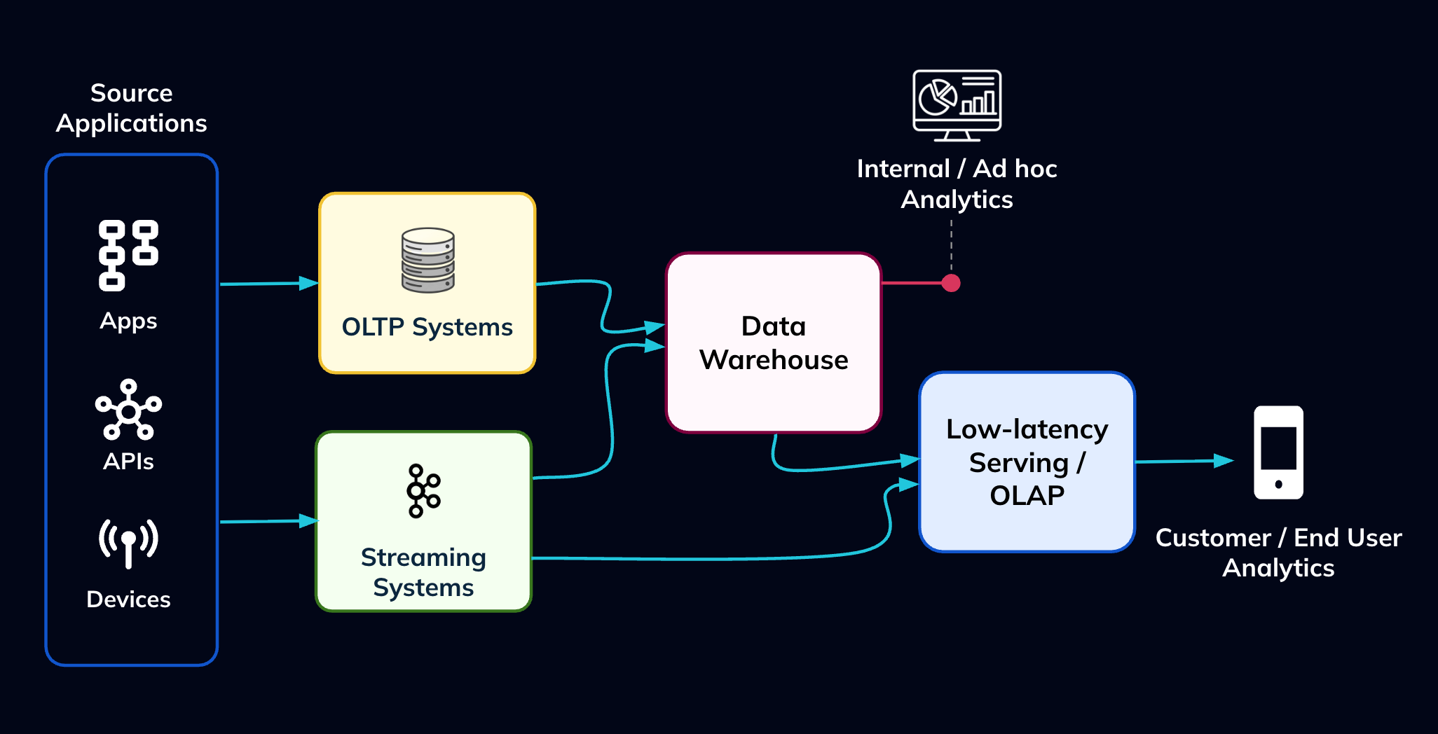 About a decade or so ago, a new set of use cases began to emerge in analytics -Serving. Unlike traditional analytics, which primarily focused on historical insights,serving aimed to put analytics directly into the hands of users and applications. This included powering end-user dashboards that update instantly, enabling personalized experiences, and providing live metrics for operational decision-making. The rise of serving workloads gave birth to OLAP and, in particular,real-time analytics databases such as Apache Pinot, ClickHouse, and others, which were purpose-built to handle thehigh concurrency and extremely low-latency queries these use cases demanded. While many of these systems ingested data in real time, they also often relied on ETL, either directly from sources or through reverse ETL from data warehouses, running in parallel with existing pipelines and further compounding the operational challenges associated with ETL.