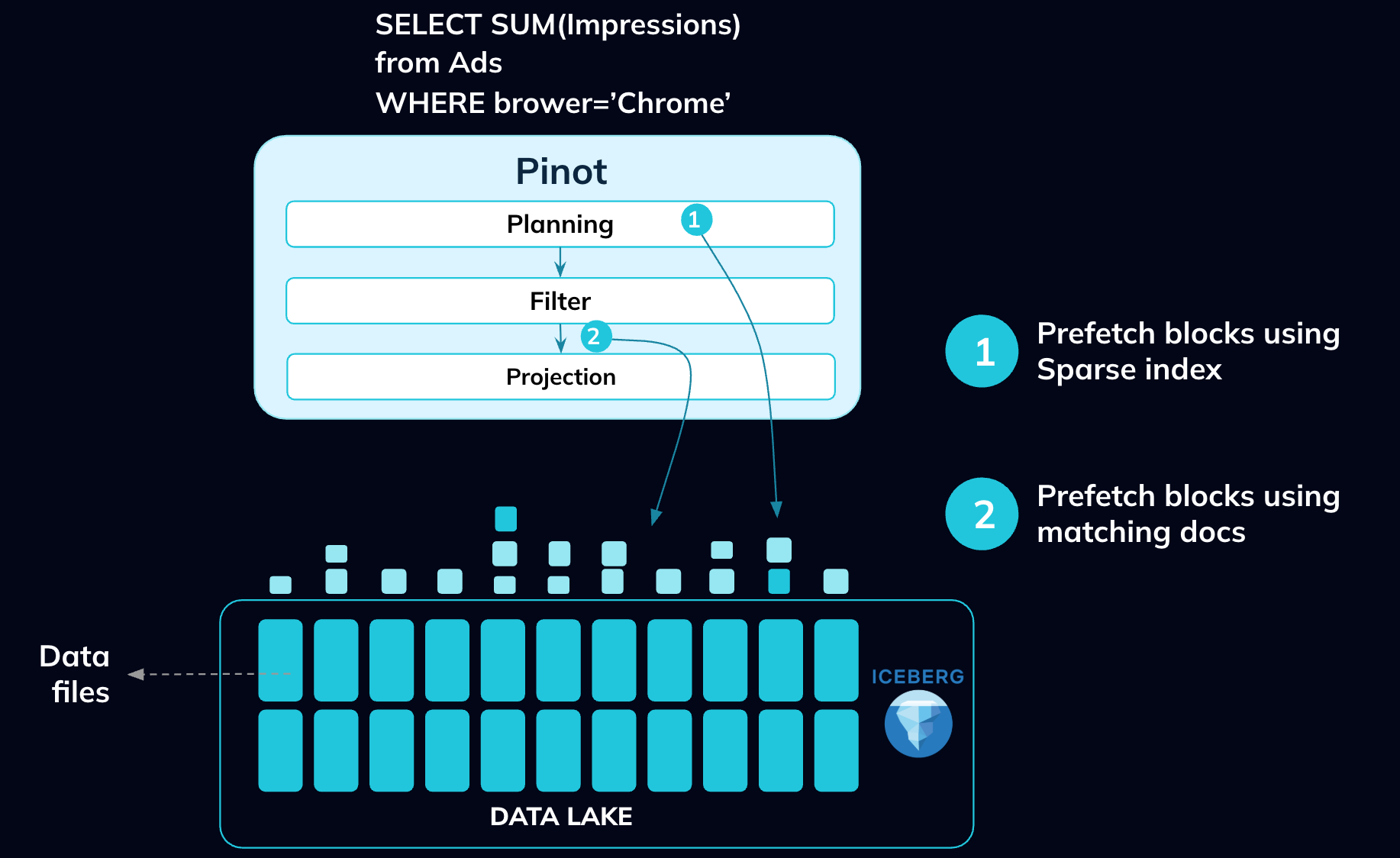 Whenever the query allows, we prefetch all necessary blocks and pipeline their fetching with query execution. During the planning phase, Pinot uses sparse indexes and metadata to identify the blocks needed post-filter, allowing prefetching to begin proactively.