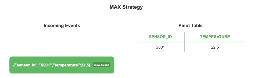 TheMAX strategy keeps the larger value between the existing value and the incoming value. This is ideal for tracking maximum readings.Example Industry Use Case: IoT (Tracking Maximum Temperature Recorded by a Sensor)