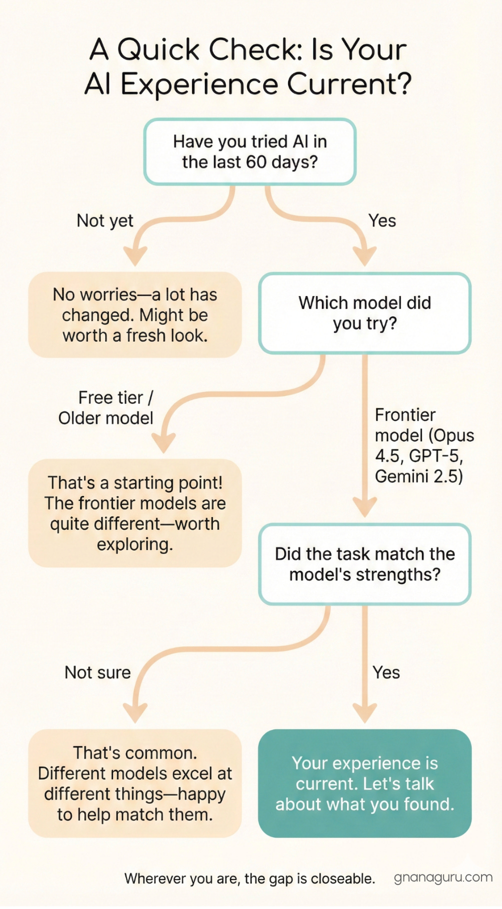 These questions matter. Because if the answer is “I tried ChatGPT free tier once in 2024 and it made stuff up,” then your skepticism isn’t about AI. It’s about something that no longer represents the frontier.
